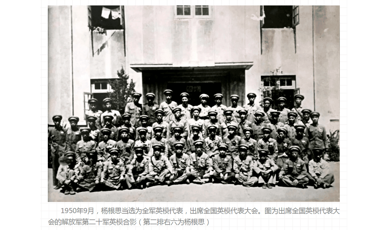 1950年春,全軍掀起了“學(xué)習(xí)文化”的熱潮。那時,楊根思所在部隊住在吳淞進(jìn)行海上練兵。不管白天練兵多么疲勞,楊根思每天夜里總要堅持學(xué)習(xí)。他說:“不學(xué)好文化,就學(xué)不好革命的理論,學(xué)不好現(xiàn)代軍事科學(xué)。我要像打仗一樣炸開新的‘碉堡’。” 一天,他坐在一盞小煤油燈下學(xué)習(xí),由于過度疲勞,帽沿被燒著了也不知道。團(tuán)的《先鋒報》刊登了《楊根思學(xué)文化》的報道。師長在軍人大會上表揚(yáng)了楊根思刻苦學(xué)習(xí)的精神,贊譽(yù)楊根思為全師的學(xué)習(xí)標(biāo)兵。” 5月,楊根思參加了軍首屆英模大會。在這屆英模大會上,楊根思被評為一級戰(zhàn)斗英雄。隨后又提升為連長。1950年,他還被選為出席全國英模代表大會的代表,9月26日,楊根思和800多名戰(zhàn)斗英雄、勞動模范受到了毛主席和朱總司令的接見。