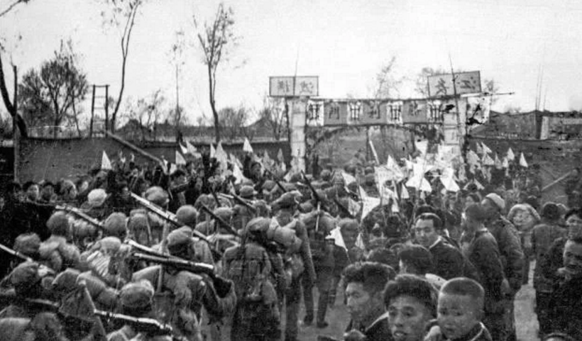 渡江戰役前夕抵達長江北岸集結的第20軍指戰員進駐泰州,受到當地群眾的熱烈歡迎