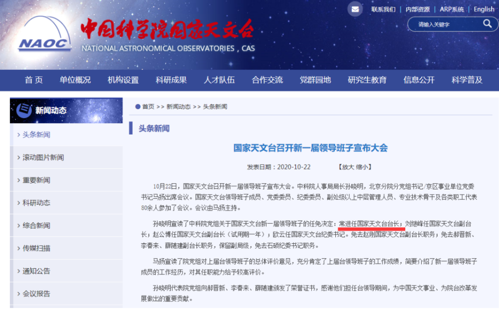 10月22日,國(guó)家天文臺(tái)新一屆領(lǐng)導(dǎo)班子宣布大會(huì)召開(kāi)。會(huì)議宣布常進(jìn)任國(guó)家天文臺(tái)臺(tái)長(zhǎng)。