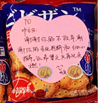 為感謝醫護人員給了殷某第二次生命,10月26日一大早,患者家屬就舉著錦旗趕到醫生辦公室,激動的連聲說“謝謝,謝謝”;患者的女兒更是用心,分別在一袋袋小小的餅干包裝上貼上小小的愛心標簽,分別寫上每一位醫護人員的名字和溫暖的話語,表達著不同的謝意。 |