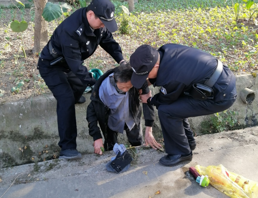 接到報警后,值班民警殷培生,輔警何承華、呂家暉迅速趕到現(xiàn)場,看到一老人臥倒在路邊水渠,衣褲濕透且全身顫抖,旁邊散落了一地的隨身物品。
