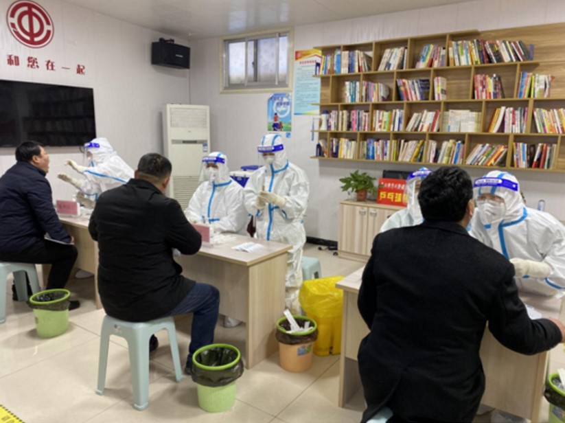 等候環節:參與人員都戴好口罩,有序入場,每人間隔1米距離排隊等候采樣。
