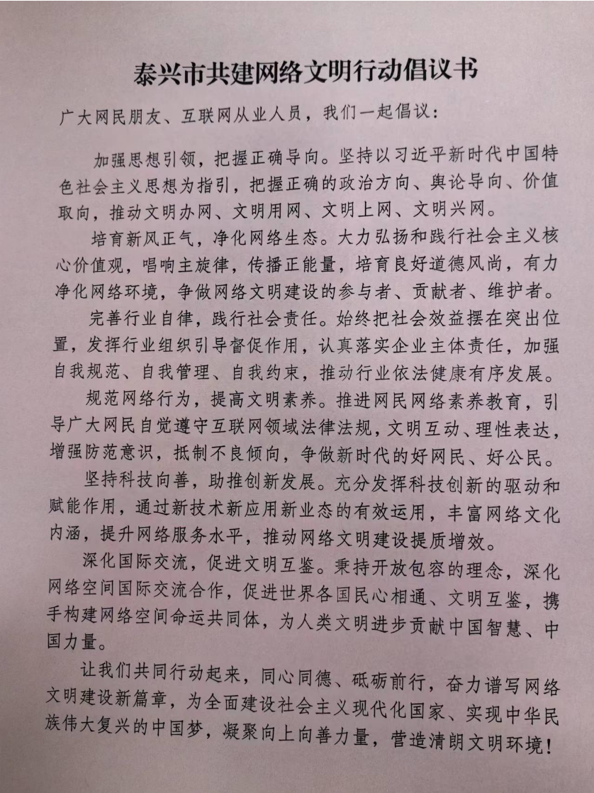 泰興市共建網絡文明行動倡議書