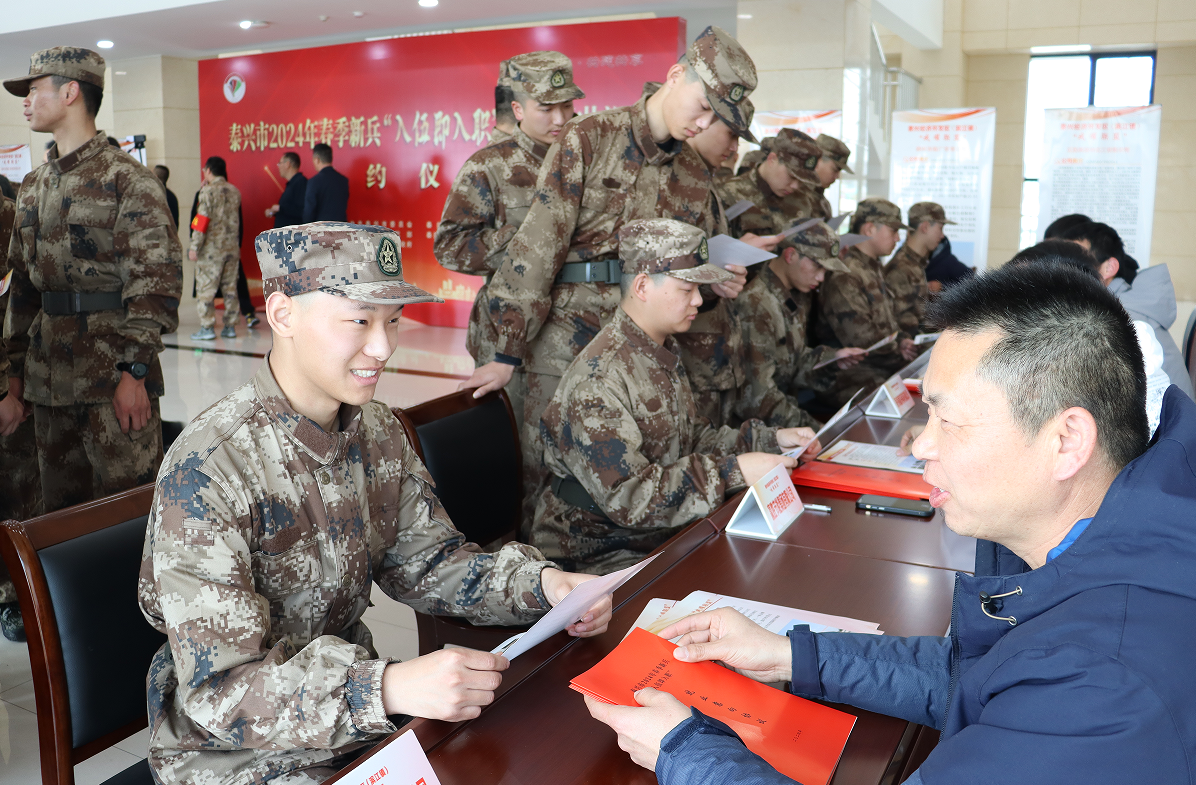 又是一年征兵季,為了讓新兵們切實感受到參軍入伍的光榮感和使命感,鼓勵他們在部隊安心服役、長期服役,江蘇省泰興市積極探索、多方聯動,強化兜底保障措施,夯實擁軍優屬基礎,全力解決后顧之憂。 為了讓新兵們切實感受到參軍入伍的光榮感和使命感,鼓勵他們在部隊安心服役、長期服役。3月11日,出征前夕,泰興市為全市春季新兵們送上了一份“永不過期的就業承諾”,開創“入伍即入職”擁軍新模式,組織10個村、30家擁軍企業組建“戎耀聯盟”,明確自2024年起,聯盟內企業每年提供一定數量優質崗位,供新兵進行洽談選擇,入伍前簽訂就業意向協議,實現“入伍即入職、退役即上崗”。通過擁軍優撫、退役安置、就業創業等方面的政策宣講,讓新兵們充分知曉服役期間的待遇保障,以及退役后的就業創業、教育培訓等相關政策。