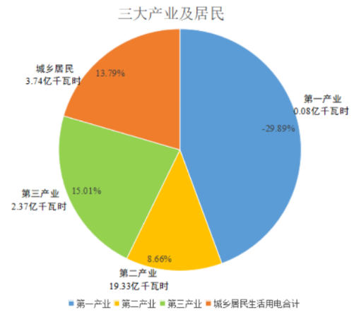 從產業(yè)角度看,除一產用電量因總量較小以及規(guī)模化生產而表征為下降外,二產、三產用電量增速甚是喜人,均超上年同期增速。第二產業(yè)用電量19.33億千瓦時,同比增長8.66%,較上年同期上升10.96個百分點;第三產業(yè)用電量2.37億千瓦時,同比增長15.01%,較上年同期上升10.95個百分點。 居民生活用電量同樣實現(xiàn)兩位數(shù)增長,達到13.79%。與生活相關的各行業(yè)用電量呈現(xiàn)出積極向上的增長態(tài)勢。其中,交通運輸、倉儲和郵政業(yè)用電量同比增長26.98%,批發(fā)零售業(yè)用電量同比增長23.81%,住宿餐飲業(yè)用電量同比增長21.47%。