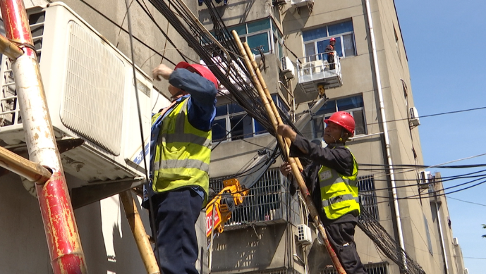 5月9日上午,在延令街道亞太新村小區(qū),施工人員正在辨別抽取、剔除小區(qū)內(nèi)廢棄不用的各類弱電線路,并將剩余線路捋直、綁扎整齊。同時利用登高車,剪除縱橫交錯的跨樓飛線,并對入戶線路進行歸集,沿墻固定。通過整治,取締“飛線”充電,消除安全隱患。