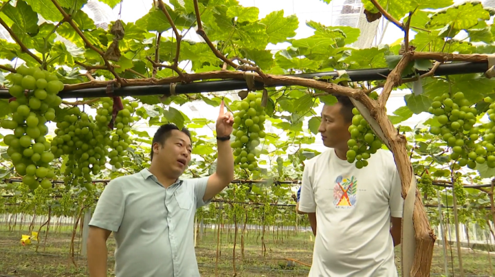 “把上面頂棚開下來,側檔也要開,頂窗也打開,注意通風,把田間濕度給降下來。”7月2日,在泰興市黃橋現代農業園習旺農業科技有限公司玻璃溫室大棚里,農技人員正指導種植戶加強葡萄生產管護。