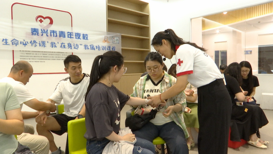 7月22日晚上7點,在泰興市新時代文明實踐中心,20多名“青年夜校”學員正在學習急救包扎技能,他們來自養老、醫療、教培等“一老一小”相關服務行業。