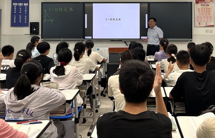 10月9日上午,在泰興市實(shí)驗(yàn)初中教育集團(tuán)文江分校,有著30多年教齡的管旺進(jìn)正用智慧屏給孩子們上數(shù)學(xué)課,曾經(jīng)復(fù)雜的數(shù)學(xué)定理如今能在屏幕上直觀呈現(xiàn)推導(dǎo)過(guò)程。“過(guò)去教學(xué)主要依靠黑板、粉筆,無(wú)其他技術(shù)支持。如今,現(xiàn)代技術(shù)構(gòu)建多元空間,沉浸式、體驗(yàn)式、真實(shí)性的場(chǎng)景讓學(xué)生接受知識(shí)更鮮活,學(xué)習(xí)活動(dòng)可視化也使教學(xué)更生動(dòng)直觀。”泰興市實(shí)驗(yàn)初中教育集團(tuán)文江分校副校長(zhǎng)管旺進(jìn)感慨道。