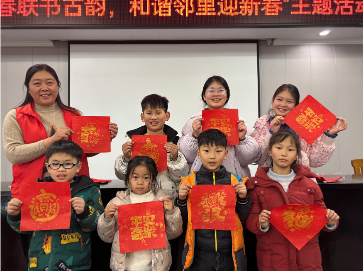 拓印享童趣,歡喜迎新春。為營造歡樂祥和的節日氣氛,20日下午,開綠村組織開展“墨香春聯書古韻,和諧鄰里迎新春”主題活動,F場,在志愿者的教導下,孩子們將福字模板置于紅紙上,拿出拓印工具,蘸取適量的金色顏料,小心翼翼地在紙上反復按壓,然后慢慢揭開模板,紅紙上呈現出一個個生動飽滿的圖案,紅墨金的色彩搭配,讓人眼前一亮。制作完成后,小朋友們互相分享著拓印成功的喜悅,真切地感受到中華優秀傳統文化的精彩與魅力。“回家我要把自己做的福字掛起來。”小朋友萬泰岐激動地說。