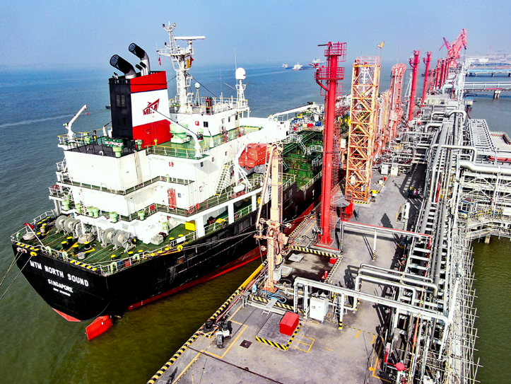 近期,新浦化學(泰興)有限公司萬噸級液體化工碼頭上也開始忙碌起來。隨著一艘外輪停靠泊位,碼頭上的裝卸臂便徐徐伸展開來,用“觸角”一樣的接頭去尋找船舶管道上相應的法蘭,自動對接上去,開始執行這一船燒堿的裝載任務。
