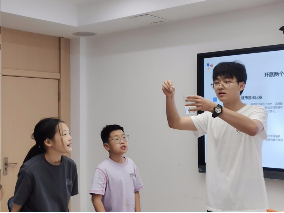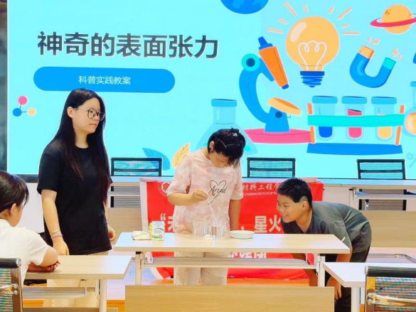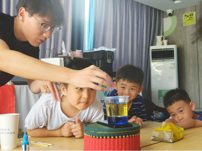 科普化學實驗室,動手實踐見真章 “紙上得來終覺淺,絕知此事要躬行”。實踐團拋棄了傳統的課堂模式,不再局限于PPT講解和靜物陳列,而是更注重于將知識與實踐結合起來,讓“死氣沉沉”的知識“活”過來,讓孩子們能真正的“看得見,摸得著,學的懂”。成員通過“海底熔巖燈”讓孩子們更直觀的“看見”二氧化碳,并理解什么是密度差導致分層;通過“水的特性實驗”讓孩子們知道水的“形狀”和溶解性,并培養孩子們節約用水的良好習慣;通過“磁力小車”向孩子們講解什么是磁場,讓他們思考小車為什么突然就動起來了等等。課堂上孩子們目不轉睛眼中充滿了對知識的好奇與渴望,“我們只想在能力范圍內盡最大努力讓孩子們領略科學的魅力。”實踐團成員說道。 開綠村 吳文昕開展科普實踐 北站社區 佘健山開展化學課堂 星光公益咖吧 侯世典開展化學課堂海底熔巖燈
