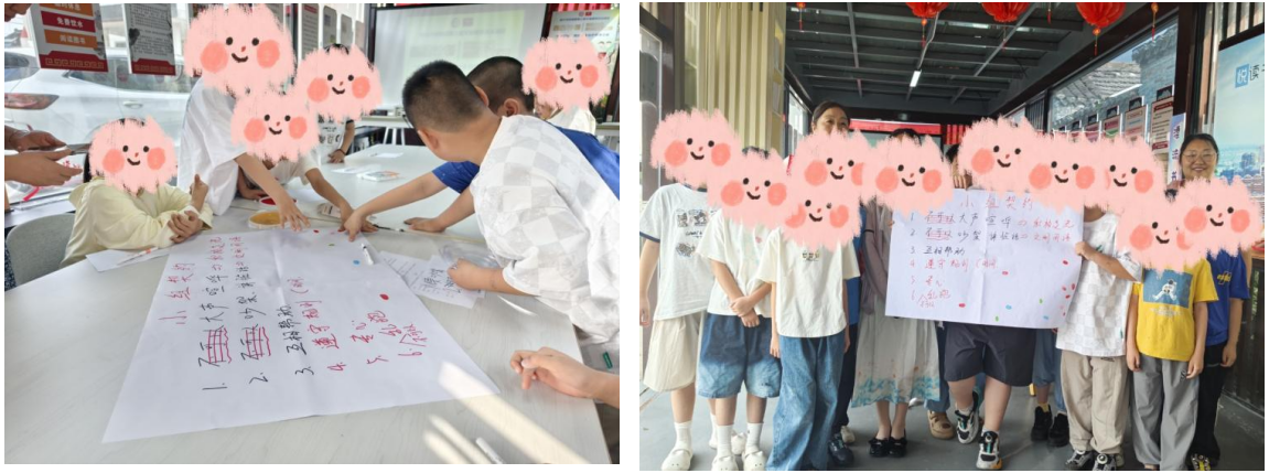 活動首先以“你劃我猜”破冰游戲消除陌生感,引導(dǎo)兒童自主制定小組契約。工作人員通過“重復(fù)提案鼓勵機(jī)制”,如“大膽說出,不考慮重復(fù)”,激發(fā)兒童規(guī)則共建參與率100%,形成可視化行為公約。 二、游戲化教學(xué),破解知識壁壘