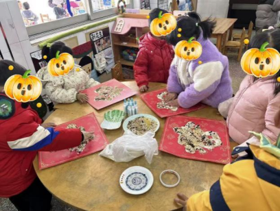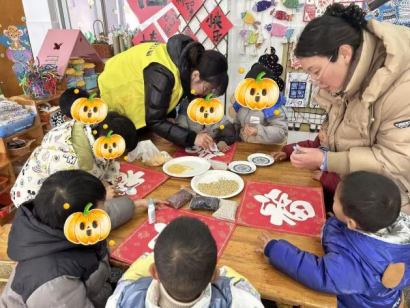 指尖生花,五谷粘福寄愿 “小朋友們,先在五谷顆粒上輕輕涂一點膠,再小心貼到福字上,注意不要把食材放進嘴里哦!”在“五谷粘福”環節,張橋鎮星火志愿隊志愿者為孩子們發放了福字底卡、五谷食材、膠棒和一次性餐墊,細致示范手工制作步驟,并反復強調安全與衛生要點。孩子們分組圍坐,在民政服務站工作人員和幼兒園老師的巡回指導下,充分發揮創意:有的用紅豆勾勒福字輪廓,有的用綠豆、小米搭配出別致圖案,動手能力較弱的小朋友也在一對一幫扶下逐步完成作品,F場歡聲笑語不斷,孩子們專注地粘貼每一粒五谷,指尖翻飛間,一幅幅色彩斑斕、充滿童趣的五谷福字逐漸成型,既鍛煉了動手能力,又寄托了對生活的美好期許。